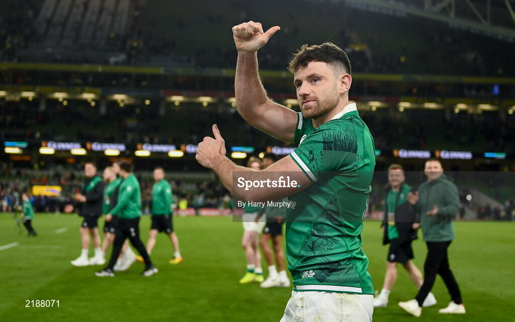 19 March 2022; Hugo Keenan of Ireland celebrates after the Guinness Six Nations Rugby Championship match between Ireland and Scotland at Aviva Stadium in Dublin. Photo by Harry Murphy/Sportsfile