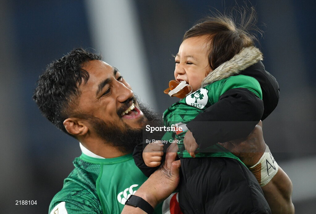 19 March 2022; Bundee Aki of Ireland celebrates with his one year old son Andronicus Junior Papamauin after the Guinness Six Nations Rugby Championship match between Ireland and Scotland at Aviva Stadium in Dublin. Photo by Ramsey Cardy/Sportsfile