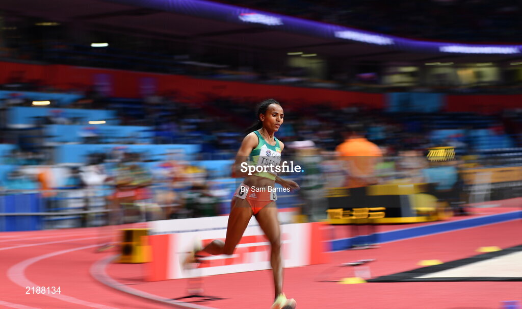 19 March 2022; Gudaf Tsegay of Ethiopia, on her way to winning the women's 1500m during day two of the World Indoor Athletics Championships at the Stark Arena in Belgrade, Serbia. Photo by Sam Barnes/Sportsfile