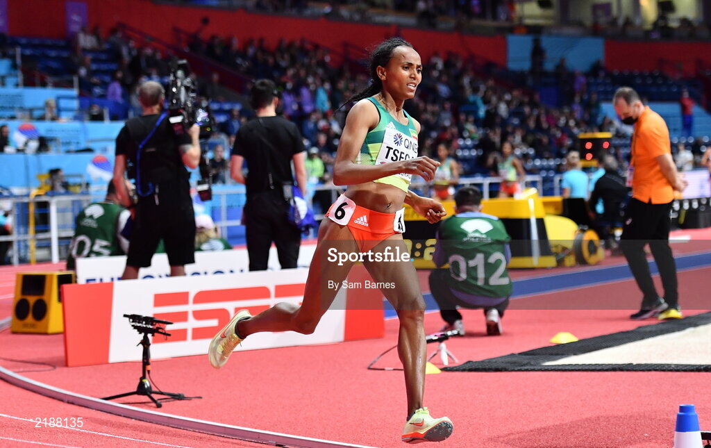 19 March 2022; Gudaf Tsegay of Ethiopia, on her way to winning the women's 1500m during day two of the World Indoor Athletics Championships at the Stark Arena in Belgrade, Serbia. Photo by Sam Barnes/Sportsfile