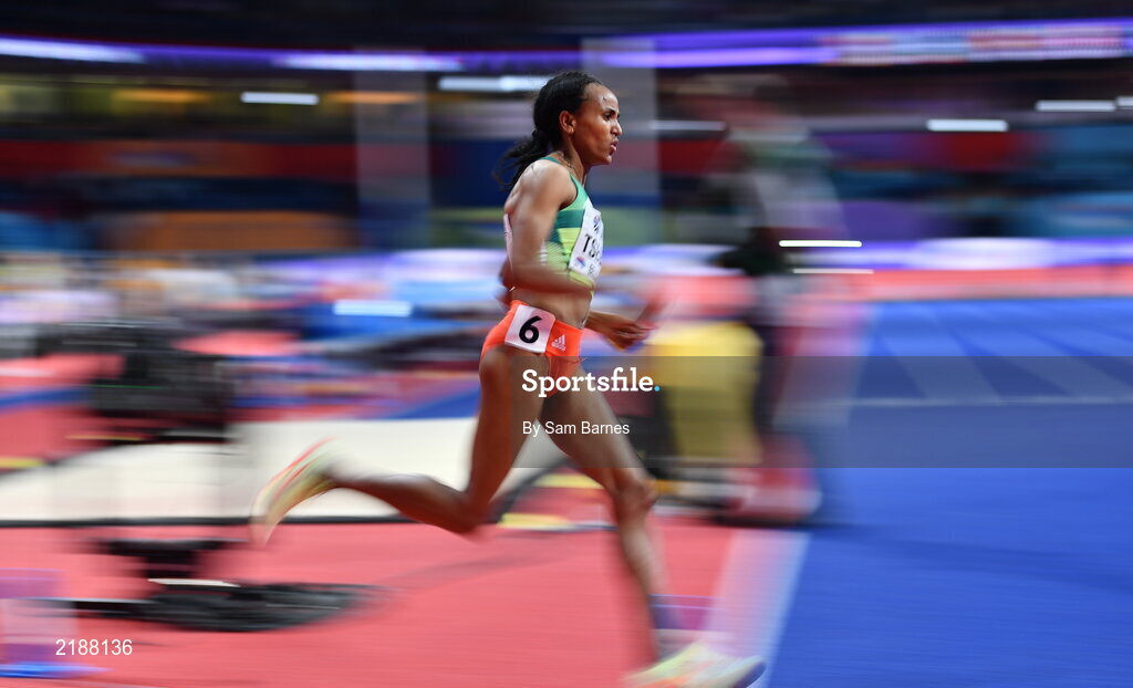 19 March 2022; Gudaf Tsegay of Ethiopia, on her way to winning the women's 1500m during day two of the World Indoor Athletics Championships at the Stark Arena in Belgrade, Serbia. Photo by Sam Barnes/Sportsfile