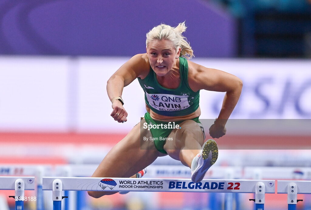 19 March 2022; Sarah Lavin of Ireland competing in the women's 60m hurdles final during day two of the World Indoor Athletics Championships at the Stark Arena in Belgrade, Serbia. Photo by Sam Barnes/Sportsfile
