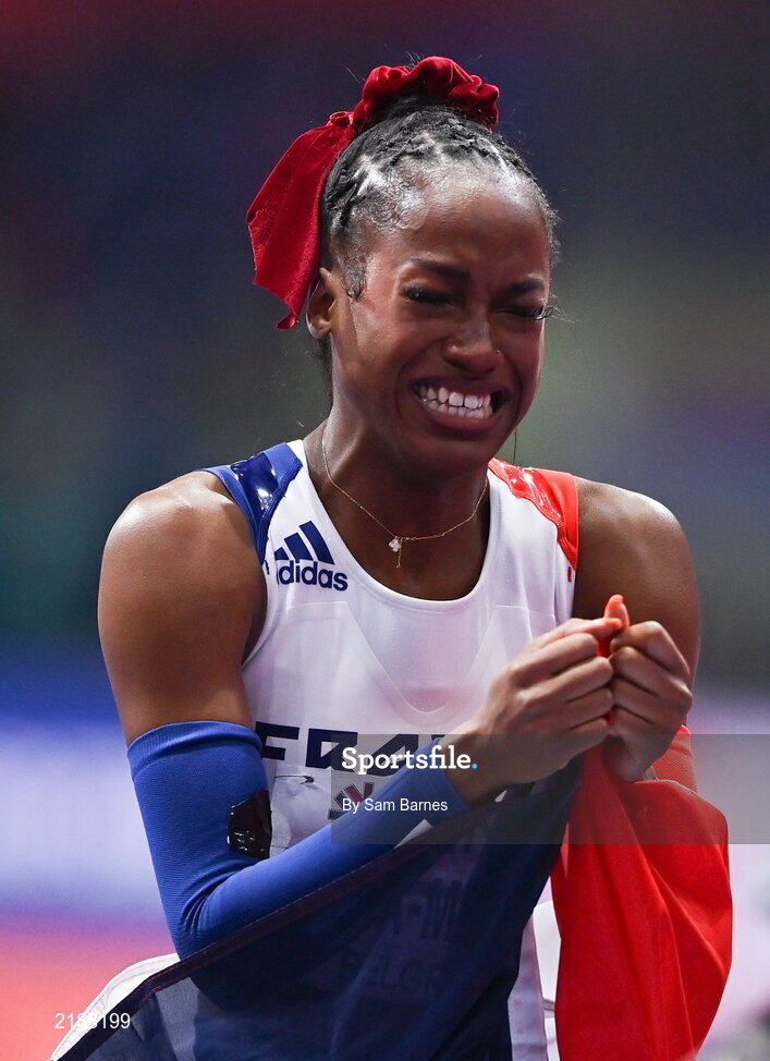 19 March 2022; Cyréna Samba-Mayela of France celebrates after winning the women's 60m hurdles final during day two of the World Indoor Athletics Championships at the Stark Arena in Belgrade, Serbia. Photo by Sam Barnes/Sportsfile