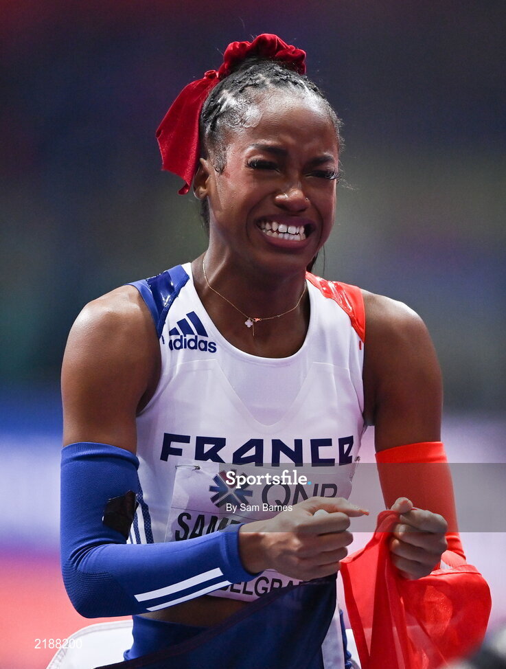 19 March 2022; Cyréna Samba-Mayela of France celebrates after winning the women's 60m hurdles final during day two of the World Indoor Athletics Championships at the Stark Arena in Belgrade, Serbia. Photo by Sam Barnes/Sportsfile