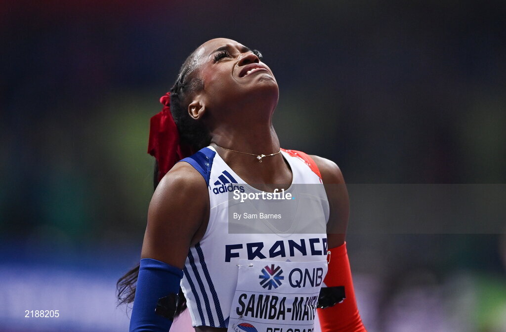 19 March 2022; Cyréna Samba-Mayela of France celebrates after winning the women's 60m hurdles final during day two of the World Indoor Athletics Championships at the Stark Arena in Belgrade, Serbia. Photo by Sam Barnes/Sportsfile