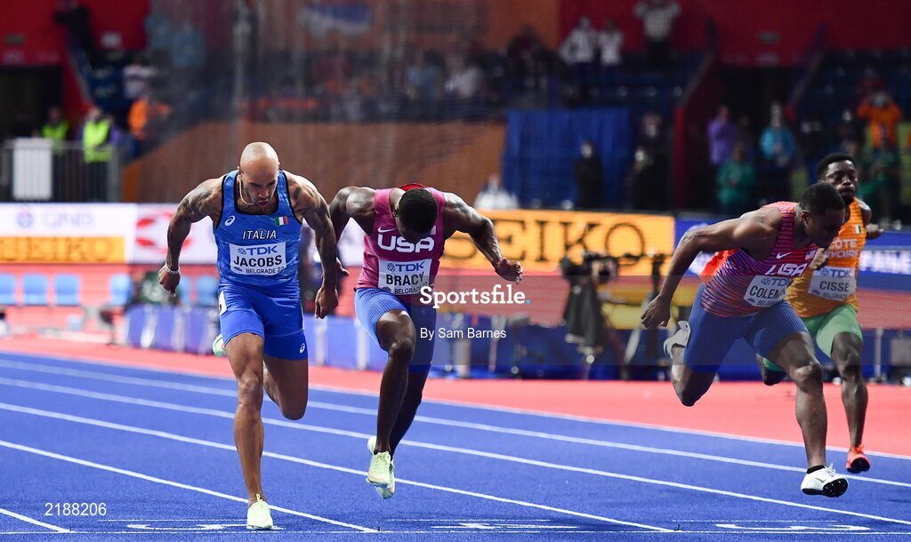 19 March 2022; Lamont Marcell Jacobs of Italy, left, on his way to winning the men's 60m final from Christian Coleman of USA, right, who finished second, during day two of the World Indoor Athletics Championships at the Stark Arena in Belgrade, Serbia. Photo by Sam Barnes/Sportsfile