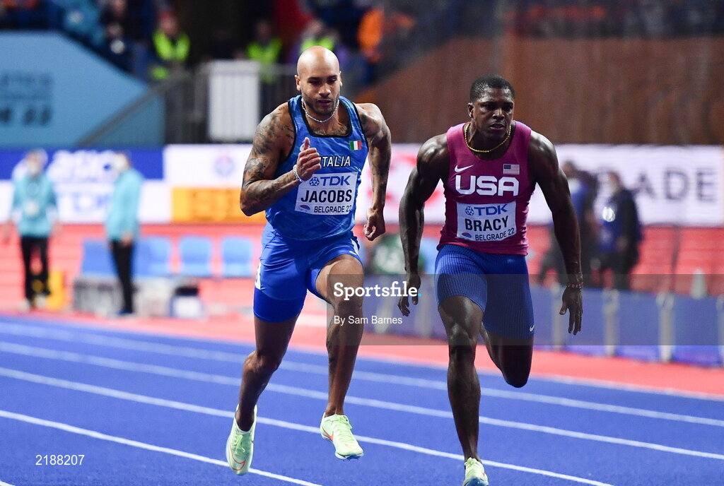 19 March 2022; Lamont Marcell Jacobs of Italy, left, on his way to winning the men's 60m final from Marvin Bracy of USA during day two of the World Indoor Athletics Championships at the Stark Arena in Belgrade, Serbia. Photo by Sam Barnes/Sportsfile