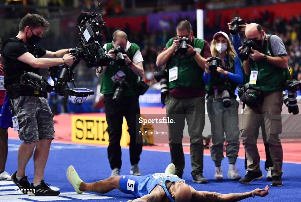 19 March 2022; Lamont Marcell Jacobs of Italy celebrates to winning the men's 60m final during day two of the World Indoor Athletics Championships at the Stark Arena in Belgrade, Serbia. Photo by Sam Barnes/Sportsfile