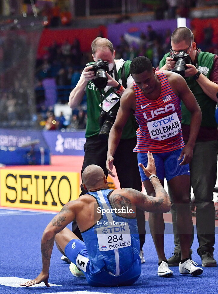 19 March 2022; Lamont Marcell Jacobs of Italy is congratulated by Christian Coleman of USA after winning the men's 60m final during day two of the World Indoor Athletics Championships at the Stark Arena in Belgrade, Serbia. Photo by Sam Barnes/Sportsfile