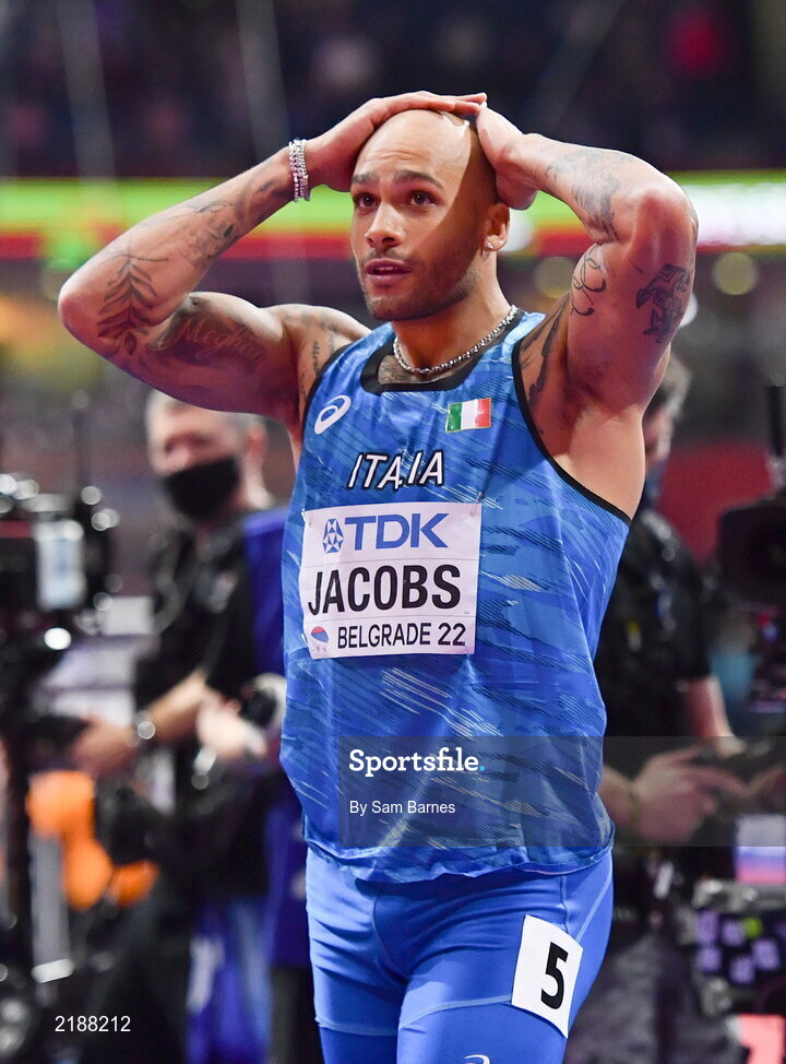 19 March 2022; Lamont Marcell Jacobs of Italy celebrates to winning the men's 60m final during day two of the World Indoor Athletics Championships at the Stark Arena in Belgrade, Serbia. Photo by Sam Barnes/Sportsfile