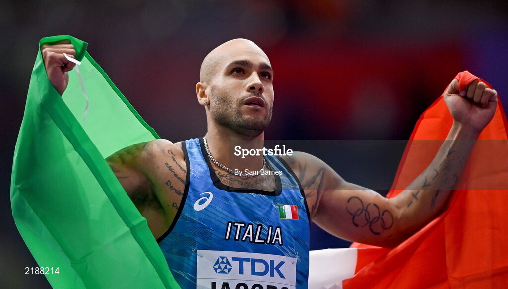 19 March 2022; Lamont Marcell Jacobs of Italy celebrates to winning the men's 60m final during day two of the World Indoor Athletics Championships at the Stark Arena in Belgrade, Serbia. Photo by Sam Barnes/Sportsfile