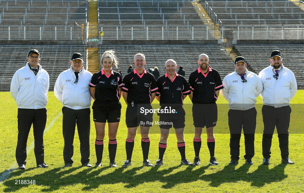19 March 2022; Referee Gus Chapman and his officials before the Lidl Ladies Football National League Division 1 Semi-Final match between Dublin and Donegal at St Tiernach's Park in Clones, Monaghan. Photo by Ray McManus/Sportsfile