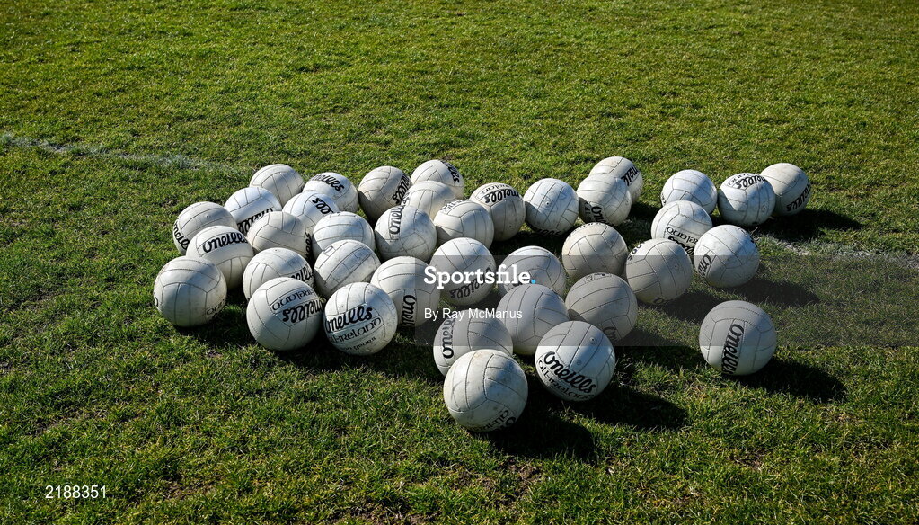 19 March 2022; O'Neills footballs on the pitch before the Lidl Ladies Football National League Division 1 Semi-Final match between Dublin and Donegal at St Tiernach's Park in Clones, Monaghan. Photo by Ray McManus/Sportsfile