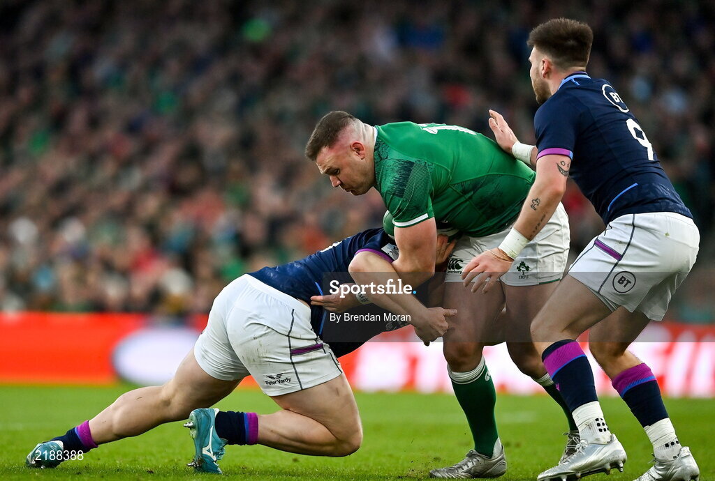 19 March 2022; Dave Kilcoyne of Ireland is tackled by WP Nel and Ali Price of Scotland during the Guinness Six Nations Rugby Championship match between Ireland and Scotland at Aviva Stadium in Dublin. Photo by Brendan Moran/Sportsfile