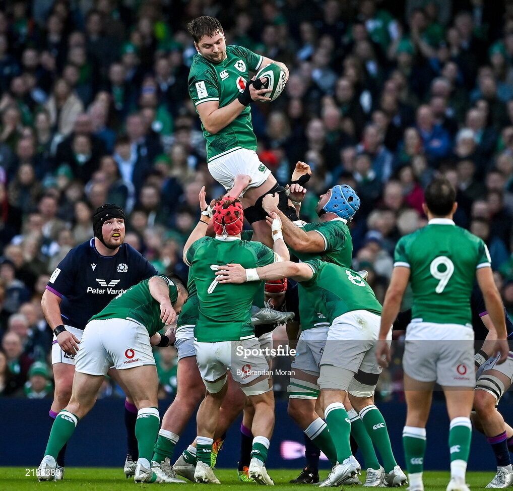 19 March 2022; Iain Henderson of Ireland wins a lineout during the Guinness Six Nations Rugby Championship match between Ireland and Scotland at Aviva Stadium in Dublin. Photo by Brendan Moran/Sportsfile