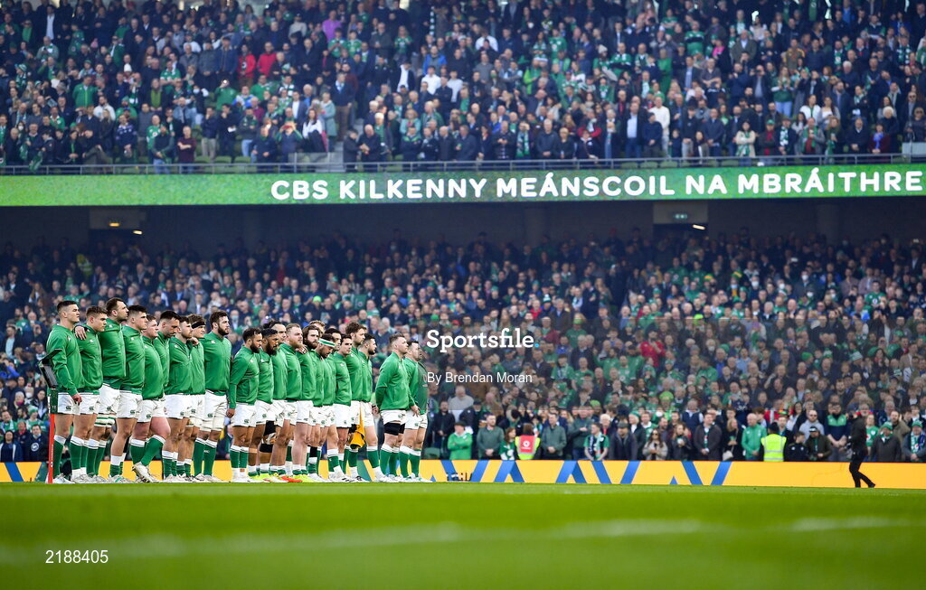 19 March 2022; The Ireland team stand for the national anthems before the Guinness Six Nations Rugby Championship match between Ireland and Scotland at Aviva Stadium in Dublin. Photo by Brendan Moran/Sportsfile