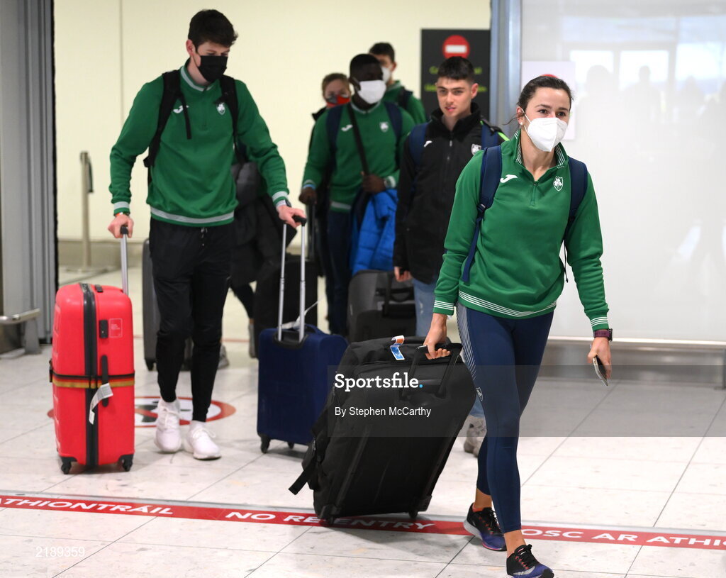 21 March 2022; Ireland's Phil Healy and team-mates arrive at Dublin Airport on the team's return from the World Indoor Athletics Championship in Serbia. Photo by Stephen McCarthy/Sportsfile