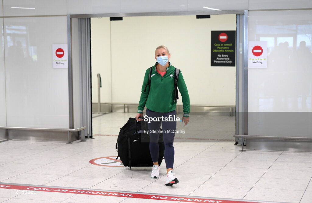 21 March 2022; Ireland's Sarah Lavin, who finished seventh in the final of the 60m hurdles, arrives at Dublin Airport on the team's return from the World Indoor Athletics Championship in Serbia. Photo by Stephen McCarthy/Sportsfile