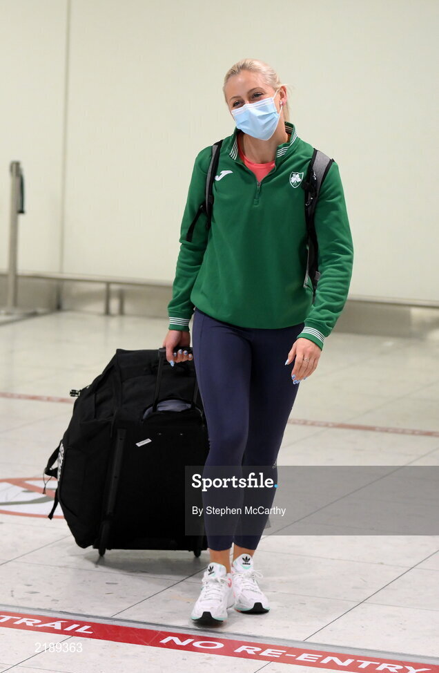 21 March 2022; Ireland's Sarah Lavin, who finished seventh in the final of the 60m hurdles, arrives at Dublin Airport on the team's return from the World Indoor Athletics Championship in Serbia. Photo by Stephen McCarthy/Sportsfile