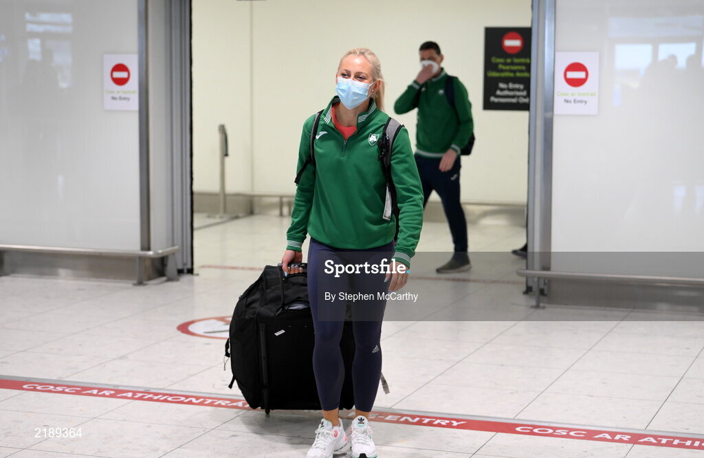 21 March 2022; Ireland's Sarah Lavin, who finished seventh in the final of the 60m hurdles, arrives at Dublin Airport on the team's return from the World Indoor Athletics Championship in Serbia. Photo by Stephen McCarthy/Sportsfile