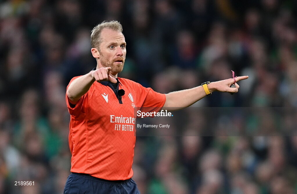 19 March 2022; Referee Wayne Barnes during the Guinness Six Nations Rugby Championship match between Ireland and Scotland at Aviva Stadium in Dublin. Photo by Ramsey Cardy/Sportsfile