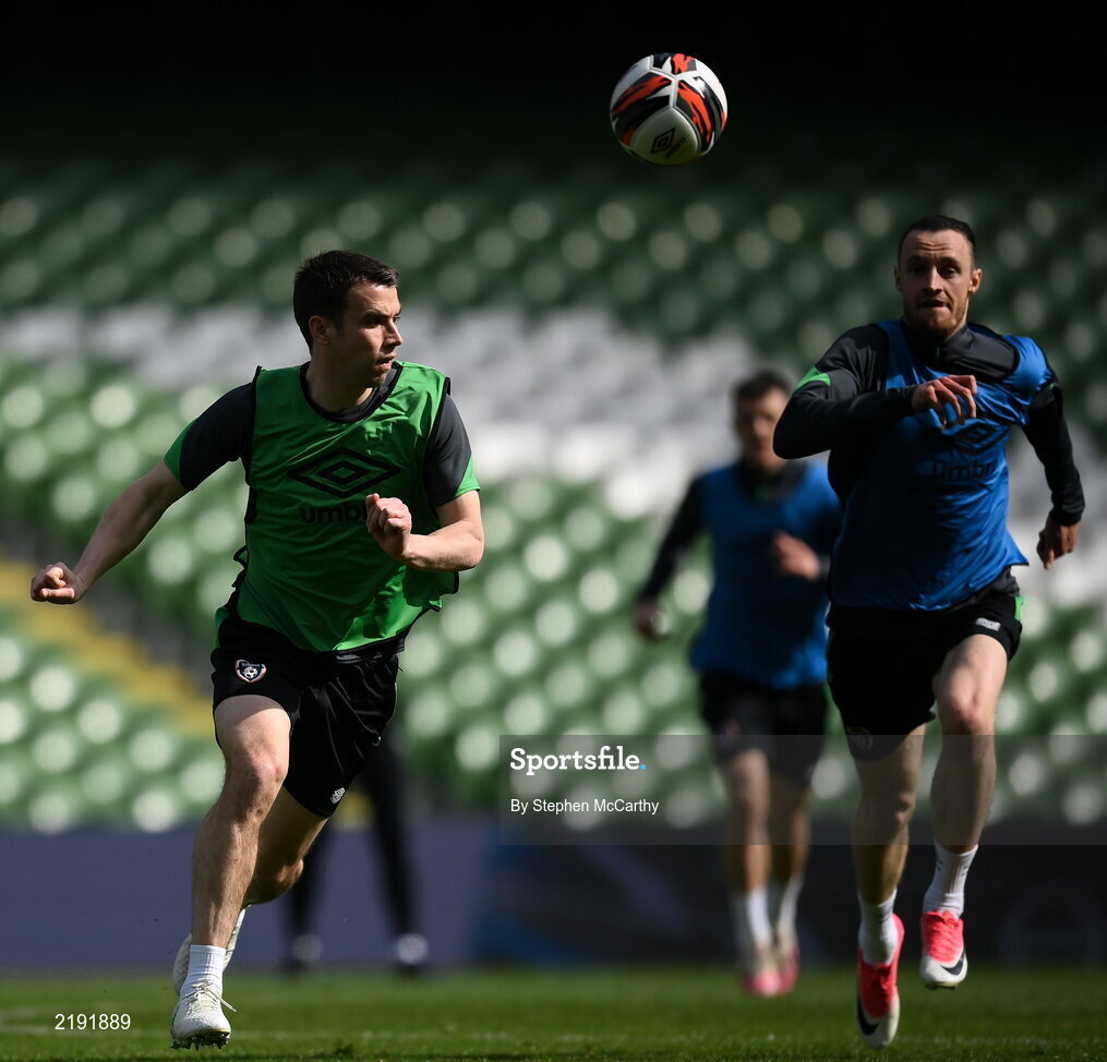25 March 2022; Seamus Coleman, left, and Will Keane during a Republic of Ireland training session at Aviva Stadium in Dublin. Photo by Stephen McCarthy/Sportsfile