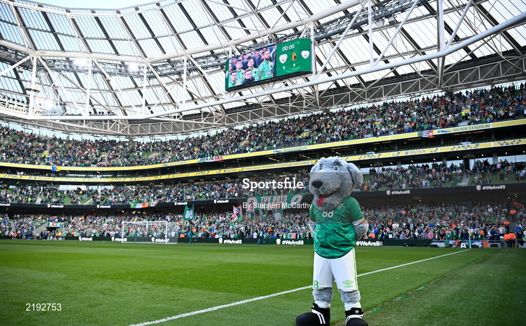 26 March 2022; Republic of Ireland mascot Mácul before the international friendly match between Republic of Ireland and Belgium at the Aviva Stadium in Dublin. Photo by Stephen McCarthy/Sportsfile