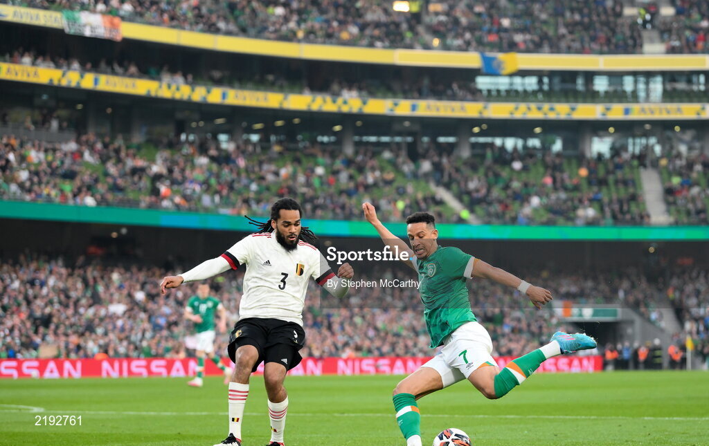 26 March 2022; Callum Robinson of Republic of Ireland in action against Jason Denayer of Belgium during the international friendly match between Republic of Ireland and Belgium at the Aviva Stadium in Dublin. Photo by Stephen McCarthy/Sportsfile