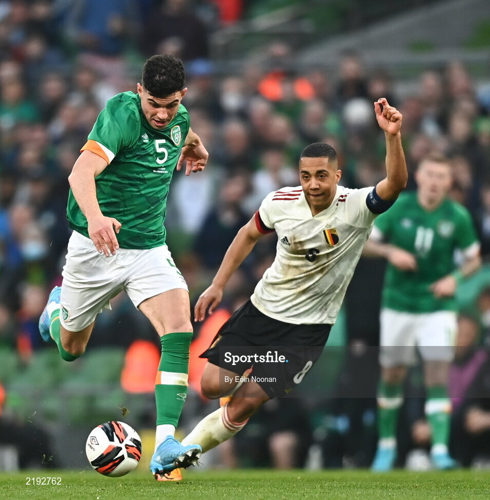 26 March 2022; John Egan of Republic of Ireland in action against Youri Tielemans of Belgium during the international friendly match between Republic of Ireland and Belgium at the Aviva Stadium in Dublin. Photo by Eóin Noonan/Sportsfile