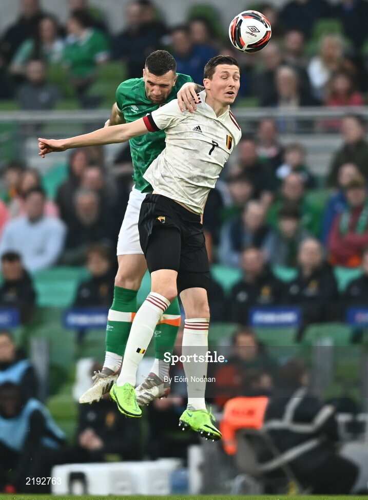 26 March 2022; Hans Vanaken of Belgium and Shane Duffy of Republic of Ireland during the international friendly match between Republic of Ireland and Belgium at the Aviva Stadium in Dublin. Photo by Eóin Noonan/Sportsfile