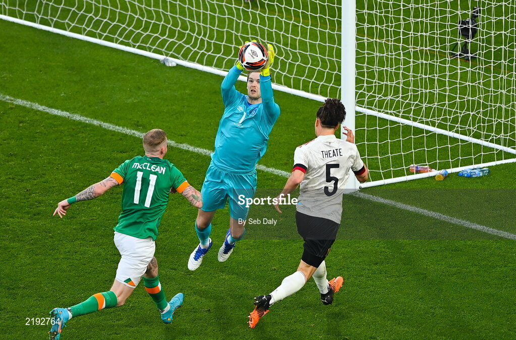 26 March 2022; Republic of Ireland goalkeeper Caoimhin Kelleher saves a shot at goal by Arthur Theate of Belgium during the international friendly match between Republic of Ireland and Belgium at the Aviva Stadium in Dublin. Photo by Seb Daly/Sportsfile