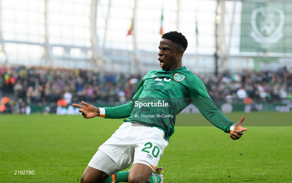 26 March 2022; Chiedozie Ogbene of Republic of Ireland celebrates after scoring his side's first goal during the international friendly match between Republic of Ireland and Belgium at the Aviva Stadium in Dublin. Photo by Stephen McCarthy/Sportsfile