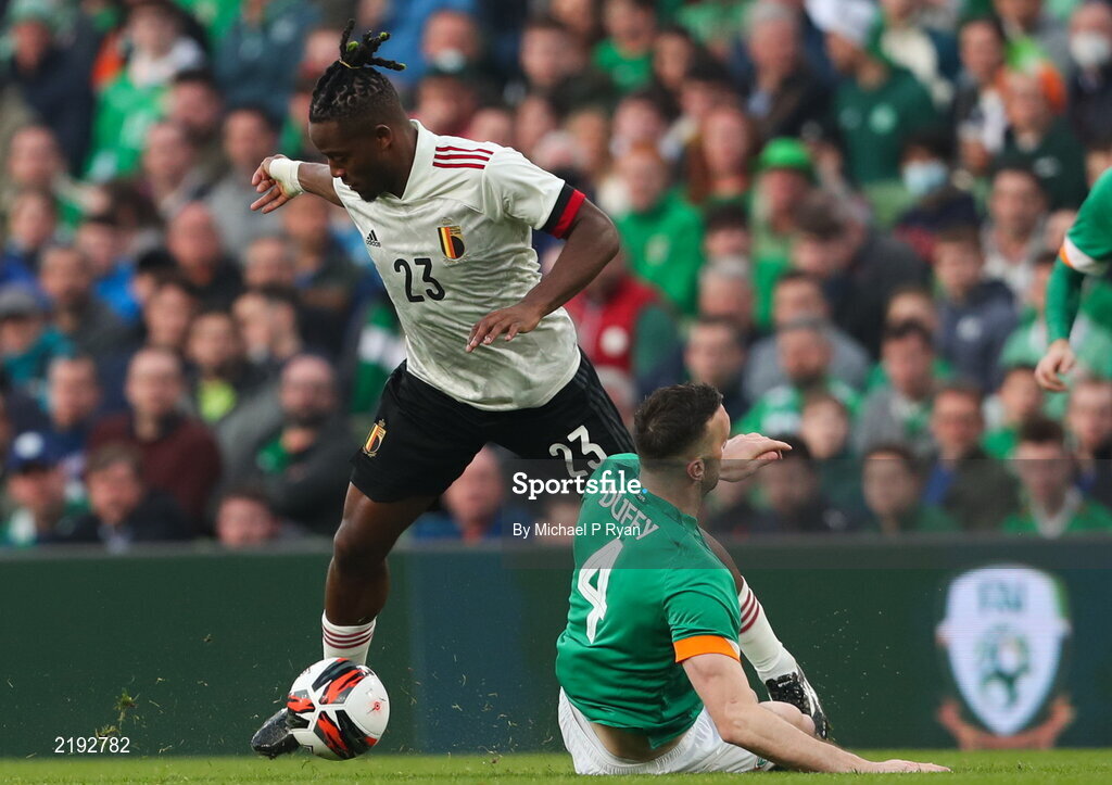 26 March 2022; Michy Batshuayi of Belgium in action against Shane Duffy of Republic of Ireland during the international friendly match between Republic of Ireland and Belgium at the Aviva Stadium in Dublin. Photo by Michael P Ryan/Sportsfile