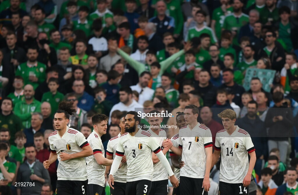 26 March 2022; Belgium players celebrate their side's second goal, scored by Hans Vanaken, during the international friendly match between Republic of Ireland and Belgium at the Aviva Stadium in Dublin. Photo by Stephen McCarthy/Sportsfile