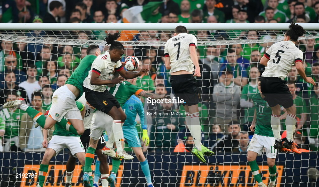 26 March 2022; Hans Vanaken of Belgium, 7, heads his side's second goal during the international friendly match between Republic of Ireland and Belgium at the Aviva Stadium in Dublin. Photo by Stephen McCarthy/Sportsfile