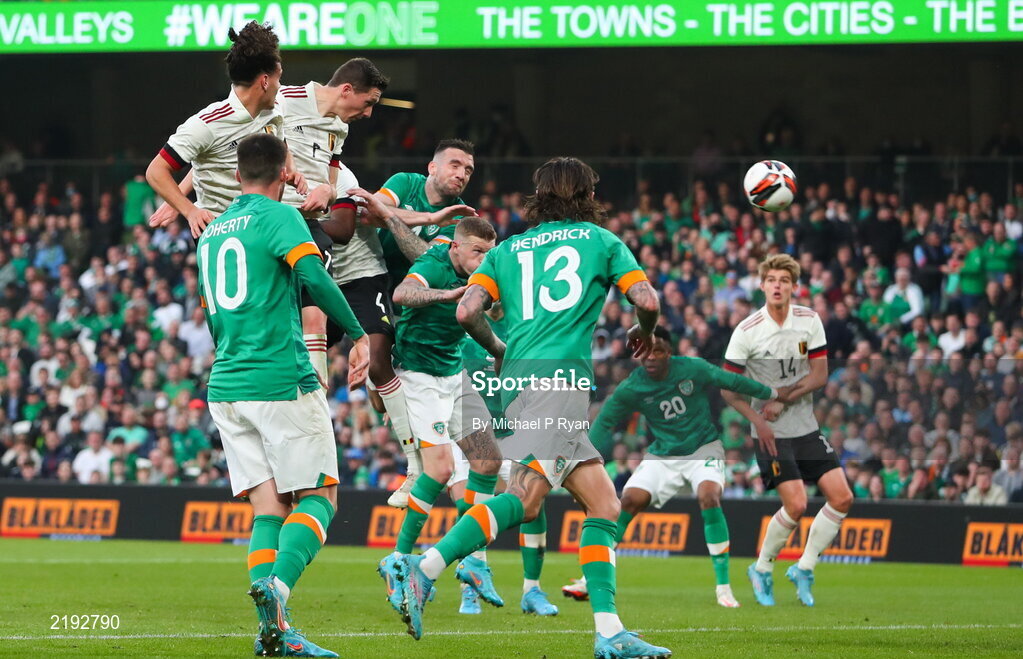 26 March 2022; Hans Vanaken of Belgium, right, heads to score his side's second goal during the international friendly match between Republic of Ireland and Belgium at the Aviva Stadium in Dublin. Photo by Michael P Ryan/Sportsfile