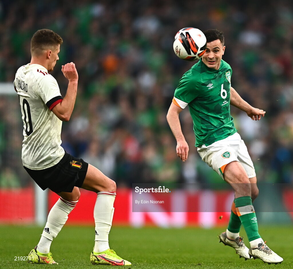 26 March 2022; Josh Cullen of Republic of Ireland in action against Thorgan Hazard of Belgium during the international friendly match between Republic of Ireland and Belgium at the Aviva Stadium in Dublin. Photo by Eóin Noonan/Sportsfile