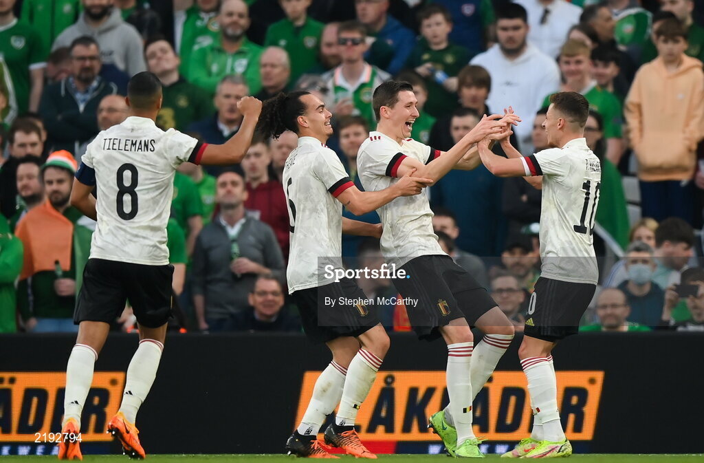 26 March 2022; Belgium players celebrate their side's second goal, scored by Hans Vanaken, during the international friendly match between Republic of Ireland and Belgium at the Aviva Stadium in Dublin. Photo by Stephen McCarthy/Sportsfile