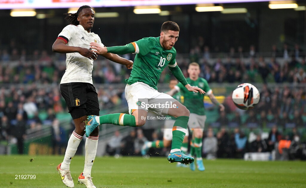 26 March 2022; Matt Doherty of Republic of Ireland in action against Dedryck Boyata of Belgium during the international friendly match between Republic of Ireland and Belgium at the Aviva Stadium in Dublin. Photo by Eóin Noonan/Sportsfile