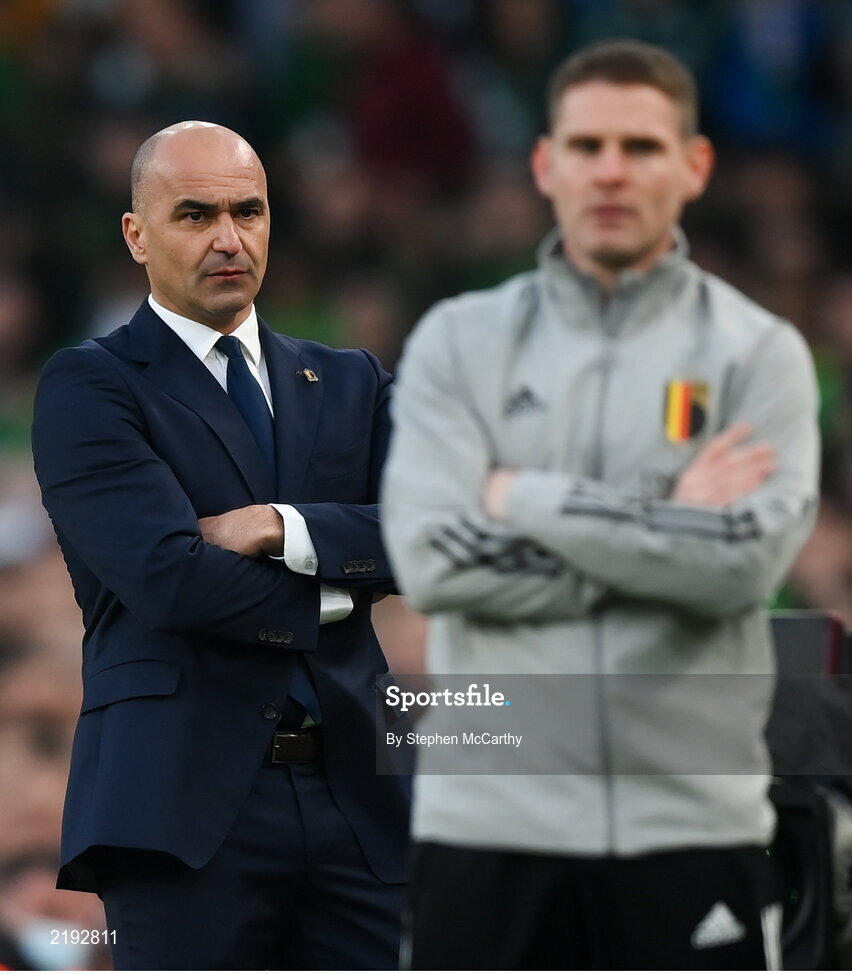 26 March 2022; Belgium manager Roberto Martinez, left, and Belgium assistant coach Anthony Barry during the international friendly match between Republic of Ireland and Belgium at the Aviva Stadium in Dublin. Photo by Stephen McCarthy/Sportsfile