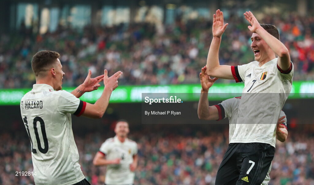 26 March 2022; Hans Vanaken of Belgium. right, celebrates after scoring his side's second goal during the international friendly match between Republic of Ireland and Belgium at the Aviva Stadium in Dublin. Photo by Michael P Ryan/Sportsfile