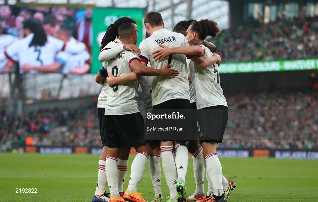 26 March 2022; Hans Vanaken of Belgium, 7, celebrates after scoring his side's second goal with team-mate during the international friendly match between Republic of Ireland and Belgium at the Aviva Stadium in Dublin. Photo by Michael P Ryan/Sportsfile