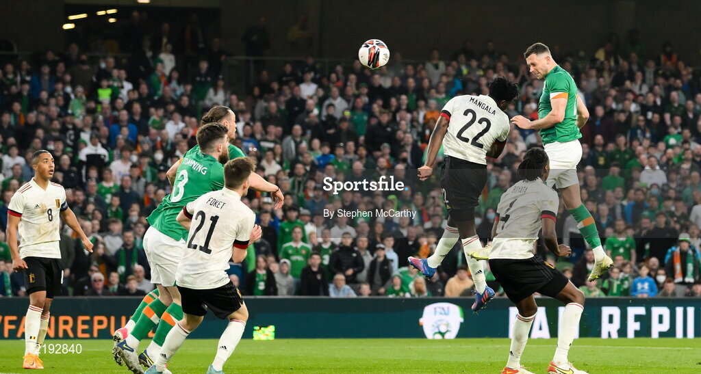 26 March 2022; Alan Browne of Republic of Ireland heads his side's second goal during the international friendly match between Republic of Ireland and Belgium at the Aviva Stadium in Dublin. Photo by Stephen McCarthy/Sportsfile