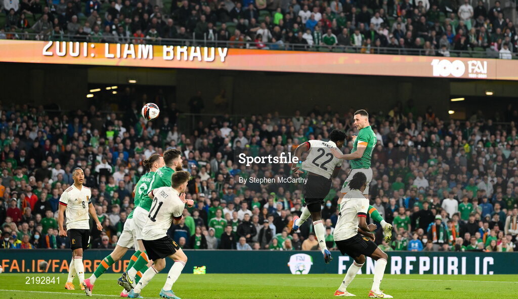 26 March 2022; Alan Browne of Republic of Ireland heads his side's second goal during the international friendly match between Republic of Ireland and Belgium at the Aviva Stadium in Dublin. Photo by Stephen McCarthy/Sportsfile