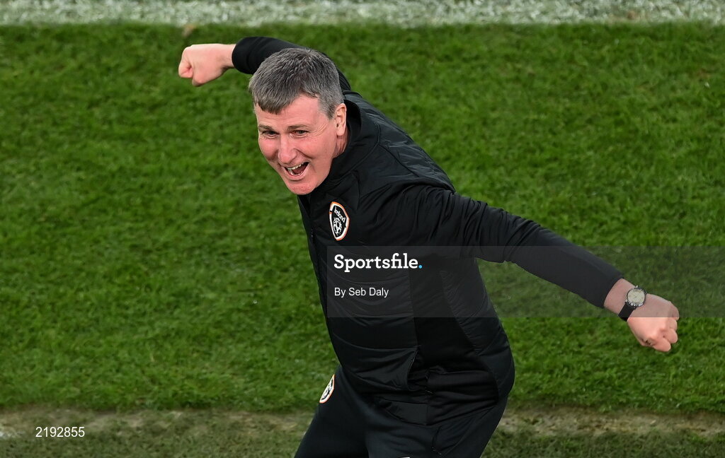 26 March 2022; Republic of Ireland manager Stephen Kenny celebrates his side's second goal, scored by Alan Browne, during the international friendly match between Republic of Ireland and Belgium at the Aviva Stadium in Dublin. Photo by Seb Daly/Sportsfile