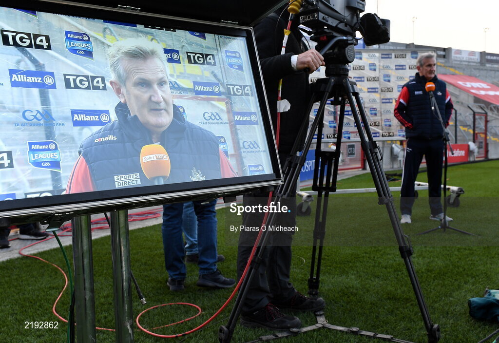 26 March 2022; Cork manager Kieran Kingston is interviewed by TG4 before the Allianz Hurling League Division 1 Semi-Final match between Cork and Kilkenny at Páirc Ui Chaoimh in Cork. Photo by Piaras Ó Mídheach/Sportsfile
