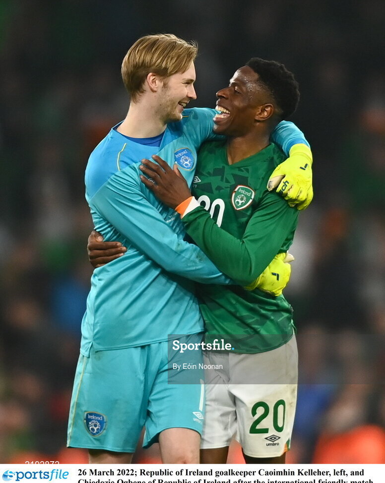 26 March 2022; Republic of Ireland goalkeeper Caoimhin Kelleher, left, and Chiedozie Ogbene of Republic of Ireland after the international friendly match between Republic of Ireland and Belgium at the Aviva Stadium in Dublin. Photo by Eóin Noonan/Sportsfile