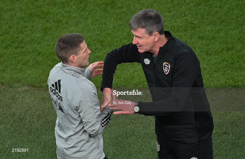 26 March 2022; Republic of Ireland manager Stephen Kenny, right, and Belgium assistant coach Anthony Barry after the international friendly match between Republic of Ireland and Belgium at the Aviva Stadium in Dublin. Photo by Seb Daly/Sportsfile