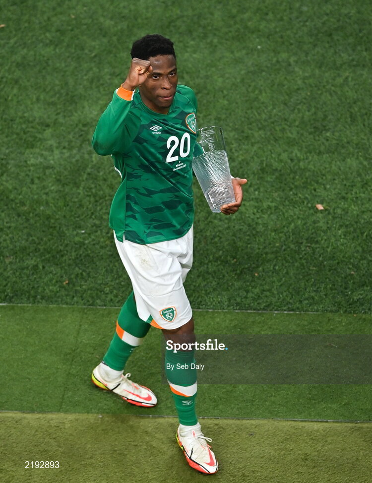 26 March 2022; Chiedozie Ogbene of Republic of Ireland with his player of the match award after the international friendly match between Republic of Ireland and Belgium at the Aviva Stadium in Dublin. Photo by Seb Daly/Sportsfile