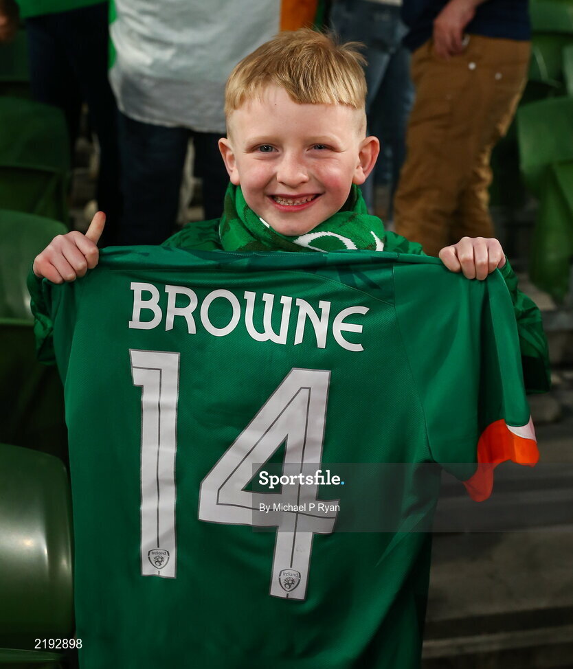 26 March 2022; Republic of Ireland supporter Drake Walker, age 6, from Carlow, with the jersey of Alan Browne after the international friendly match between Republic of Ireland and Belgium at the Aviva Stadium in Dublin. Photo by Michael P Ryan/Sportsfile